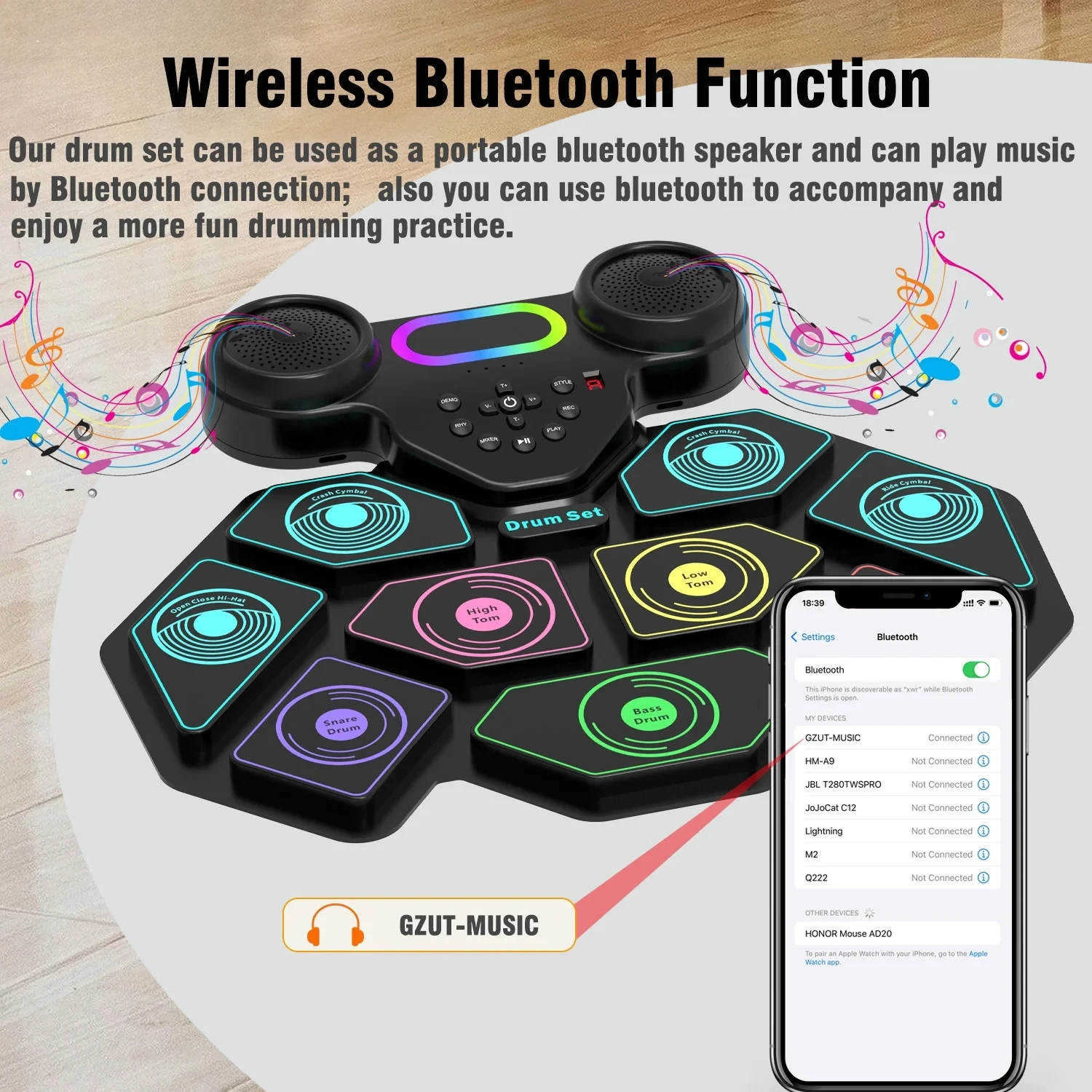 This electric drum set function settings with LED digital panel, DEMO Songs and rhythms, volume/speed control, record and play, additional with Bluetooth function and colorful LED lights effects.
