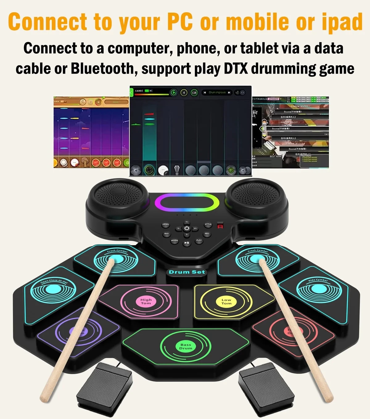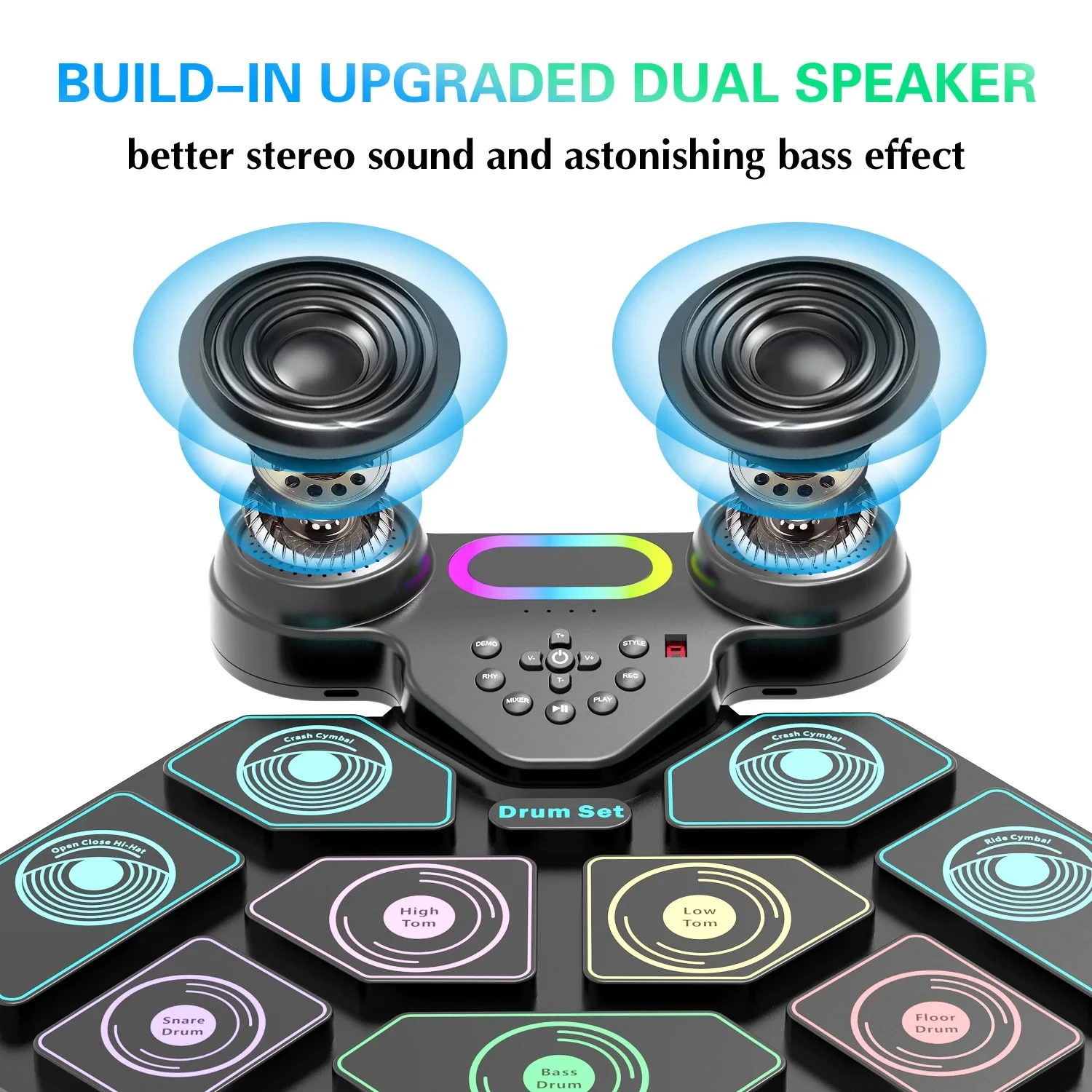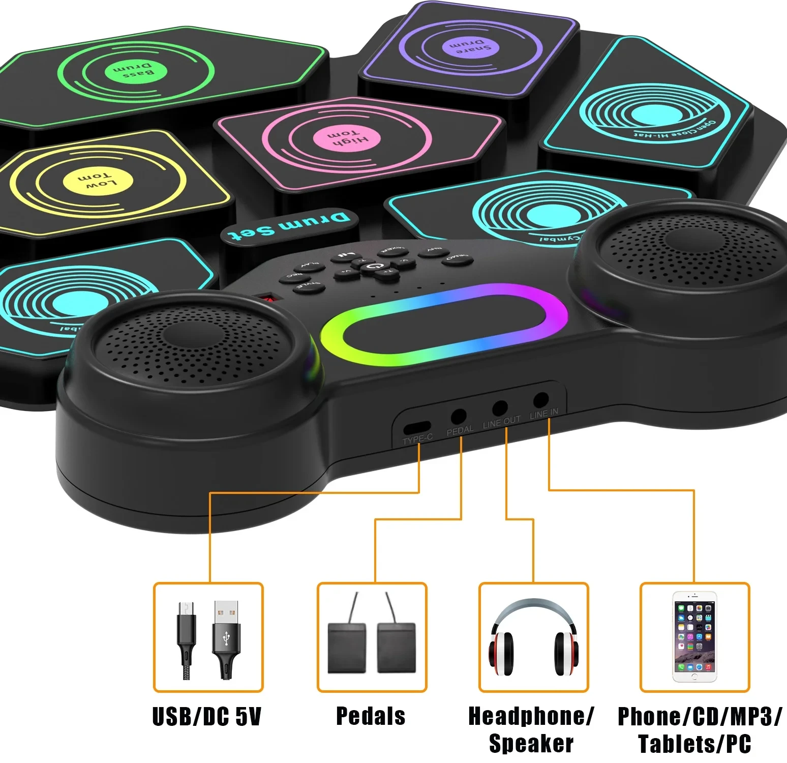 - Portable & Compact Design: This electronic drum set is built for on-the-go practice. Its lightweight and compact design makes it easy to roll up, pack, and carry in a backpack. You can set it up in a bedroom, a studio apartment, or take it on a trip without taking up much space.