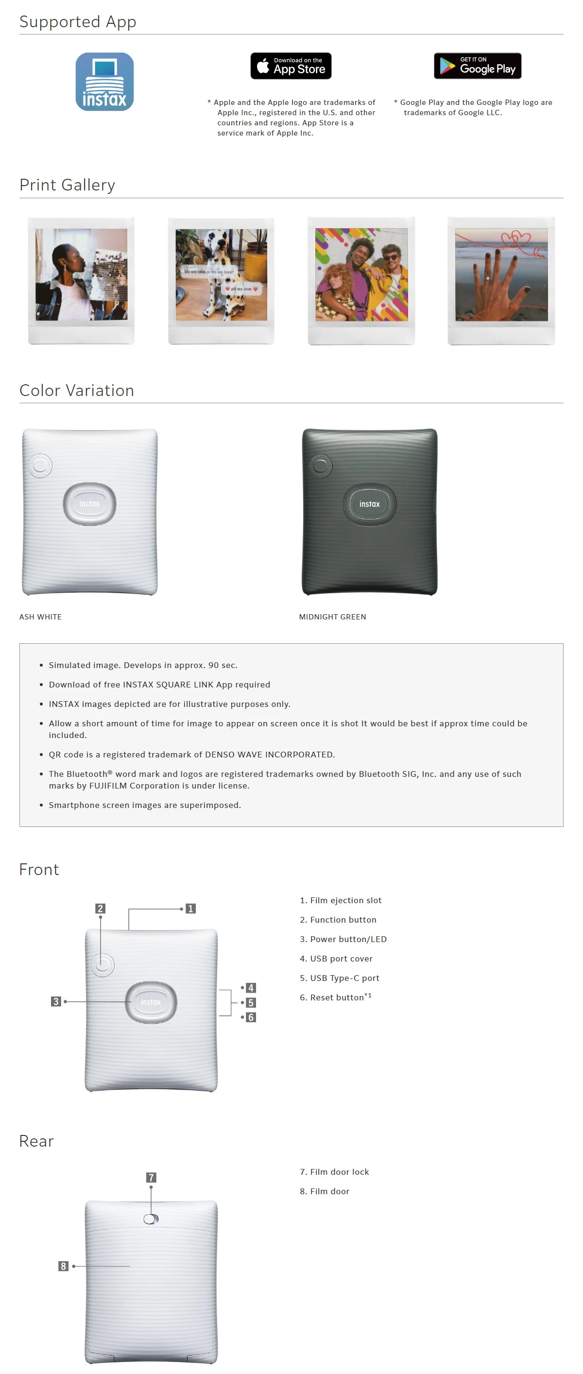 Capture and share your memories effortlessly with the FUJIFILM INSTAX SQUARE LINK Smartphone Photo Printer. This innovative device combines cutting-edge technology with a sleek, portable design, allowing you to print high-quality photos directly from your smartphone. Featuring Bluetooth 4.2 connectivity, the INSTAX SQUARE LINK ensures quick and seamless pairing with your device, making photo printing a breeze. Available in sophisticated Midnight Green and Ash White colors, this photo printer is as stylish as it is functional.